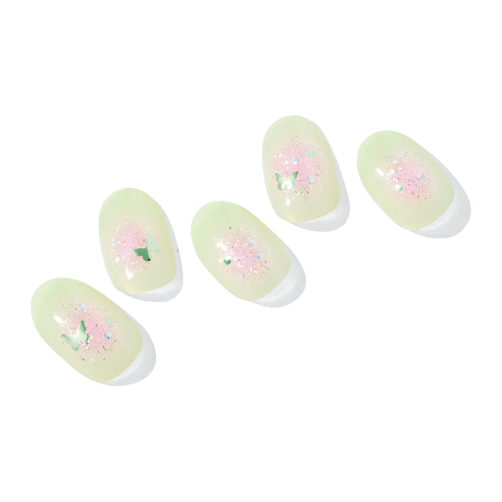 With a soft pink base that blooms like ripe fruit, this vibrant manicure is accented with glimmering glitter and holographic butterfly decals. Under sunlight, it catches the light beautifully—brightening the fingertips and lifting the mood with its playful, radiant charm.