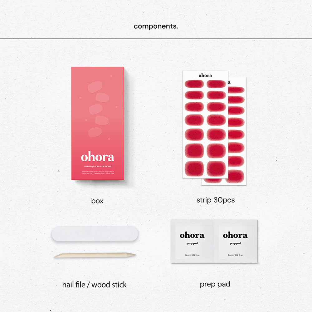 Strawberry red gently diffuses from the edges, creating a soft gradient over a translucent base. Touches of glitter add playful sparkle, bringing a lively, cheerful energy to the design. It’s a fresh and fruity look that lets the sweetness of strawberries bloom right at your fingertips.